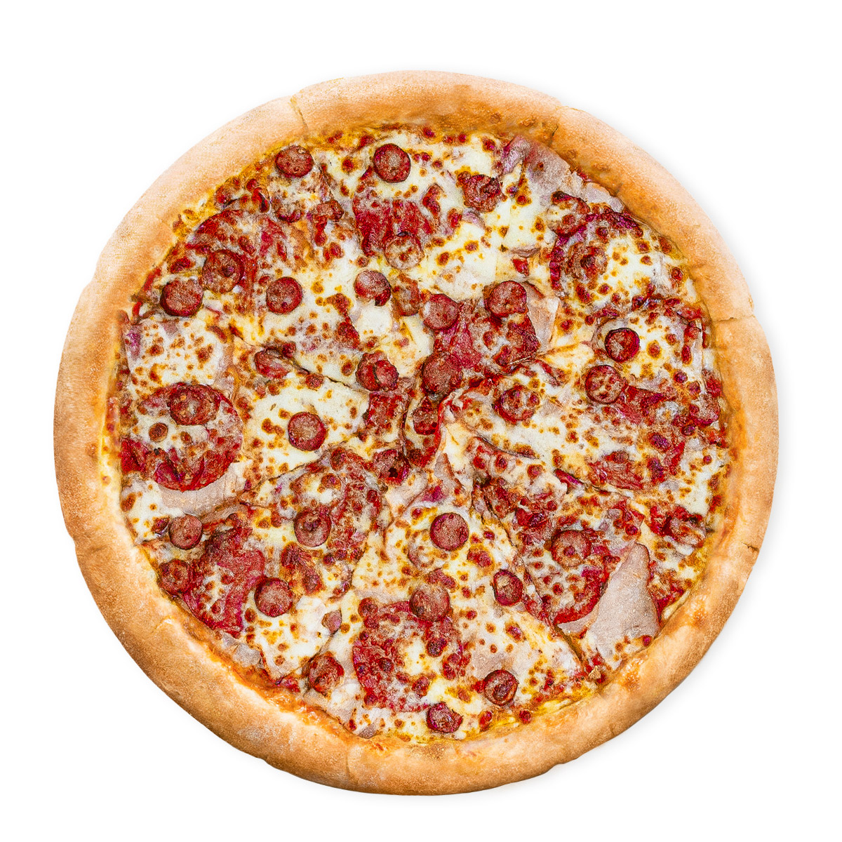 (blat, sos pizza, mozzarella, salam, pastrama porc, bacon, carnati)