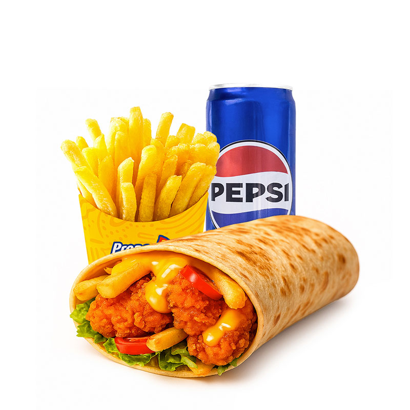 5 bucati pui nepicant, cartofi, sos de usturoi si o doza suc (Pepsi sau Mirinda)