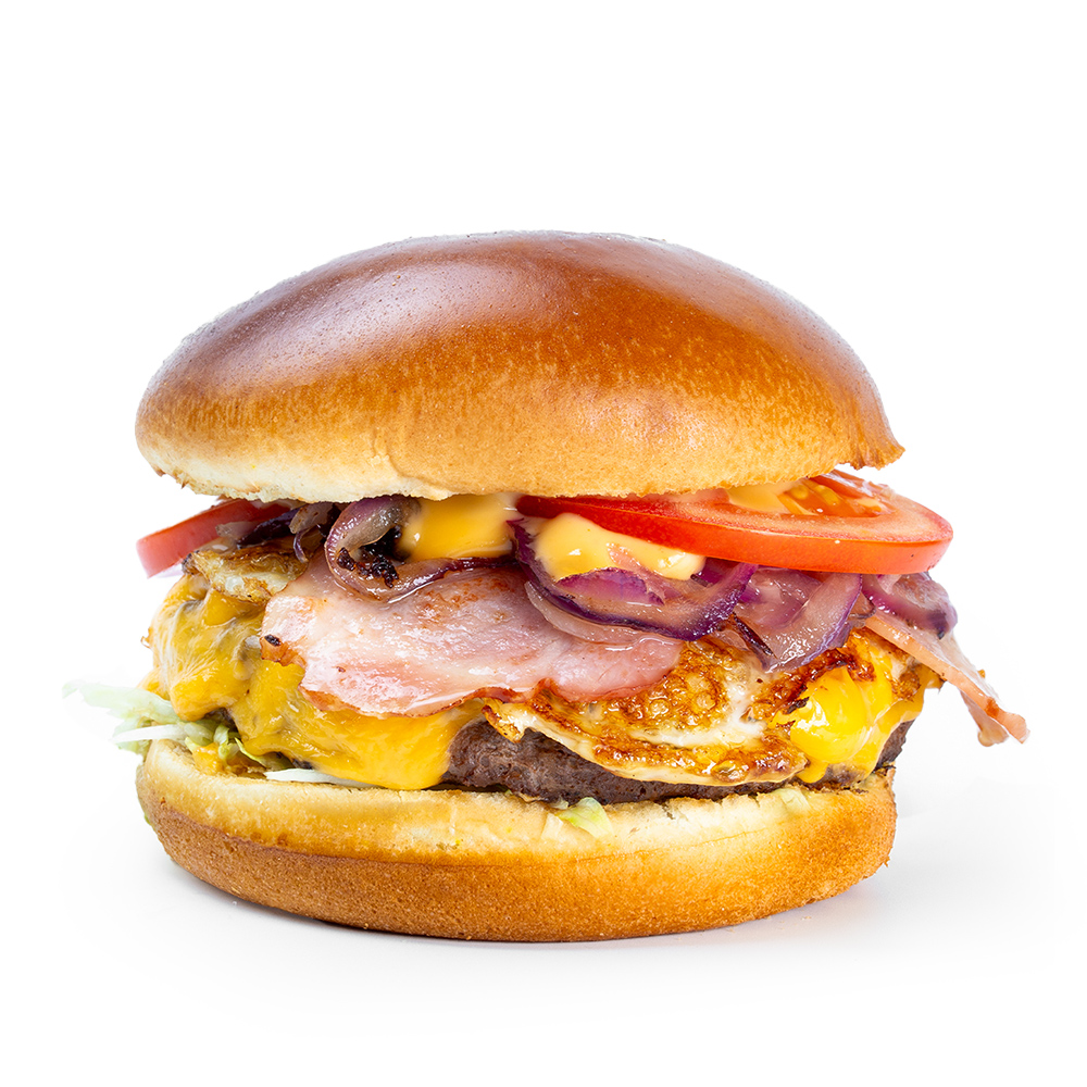 (Carne vita, branza cheddar, salata, ou, bacon, rosii, ceapa, sos burger)