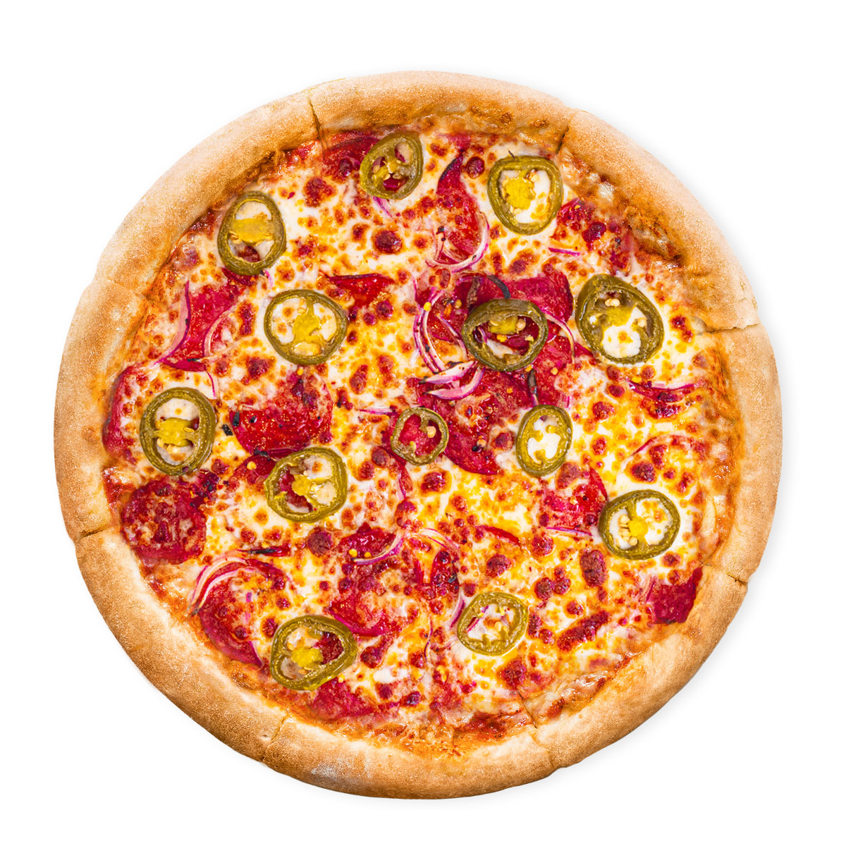 (blat, sos pizza, mozzarella, chilli, ceapa rosie, salam picant, jalapeno)