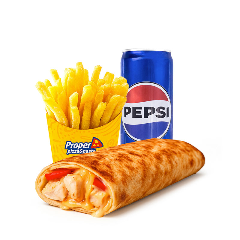 (blat, sos pizza, mozzarella, cartofi, bacon, piept de pui, masline)