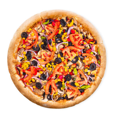 (blat, sos pizza, ciuperci, ceapa rosie, ardei mixt, masline, porumb, rosii cherry)