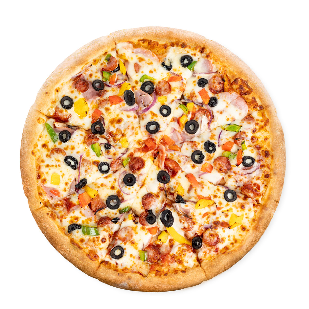 (blat, sos pizza, mozzarella, ceapa, ciuperci, sunca, carnati, ardei, masline)