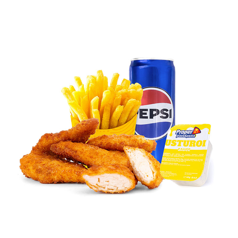 5 bucati pui nepicant, cartofi, sos de usturoi si o doza suc (Pepsi sau Mirinda)