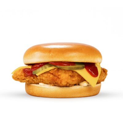 (Chifla, snitel pui, castraveti murati, cheddar, maioneza, ketchup)