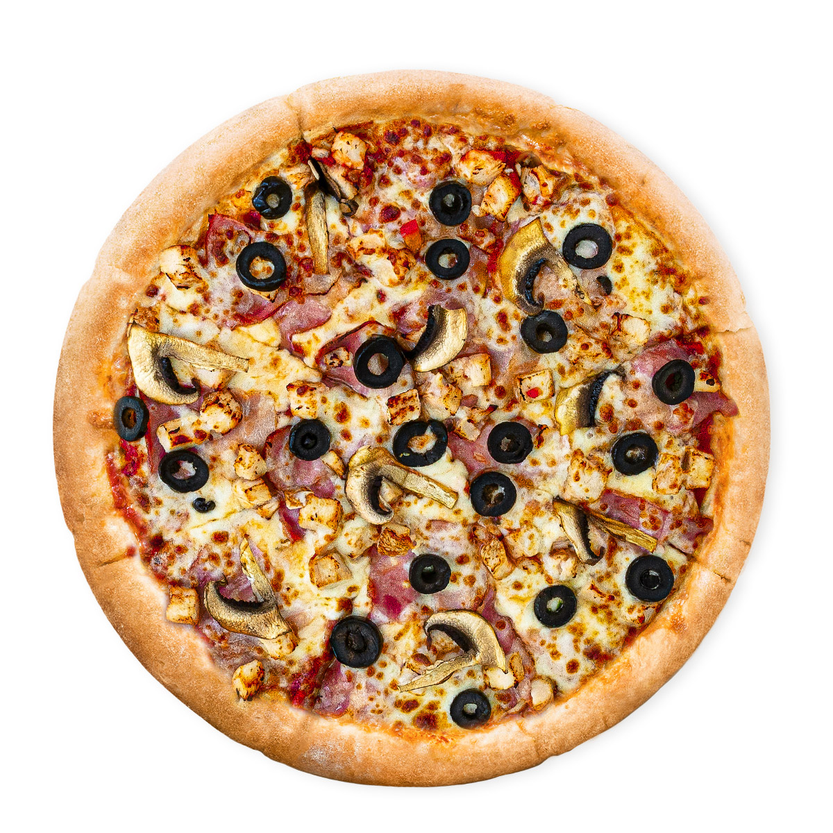 (blat, sos pizza, mozzarella, ciuperci, bacon, piept de pui, masline)