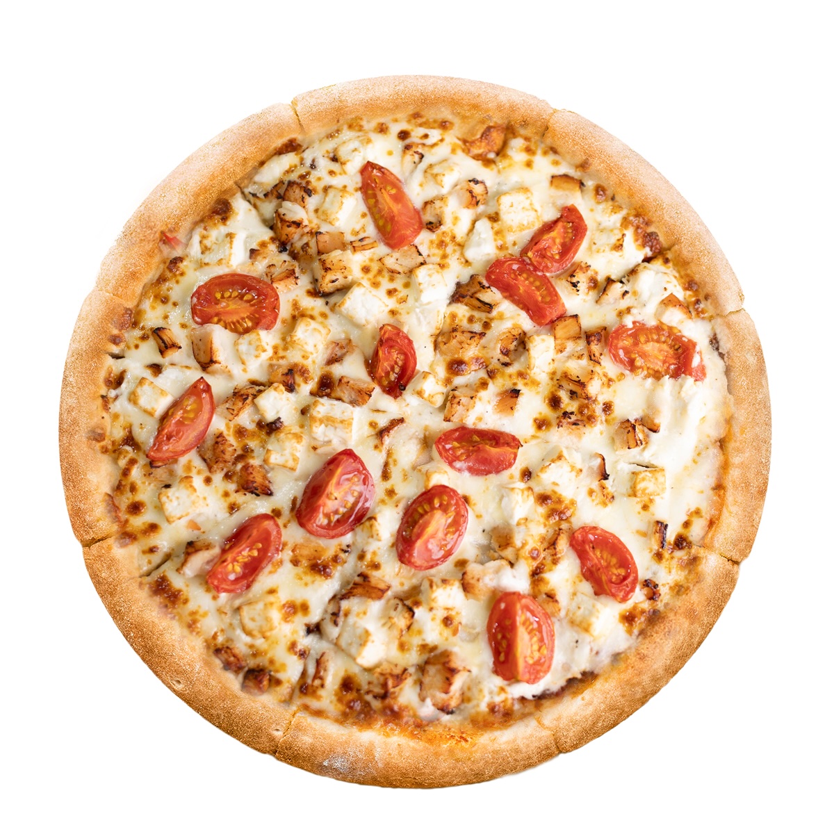 (aluat pizza, sos alb, mozzarela + topping pizza, piept de pui, rosii cherry, branza feta)