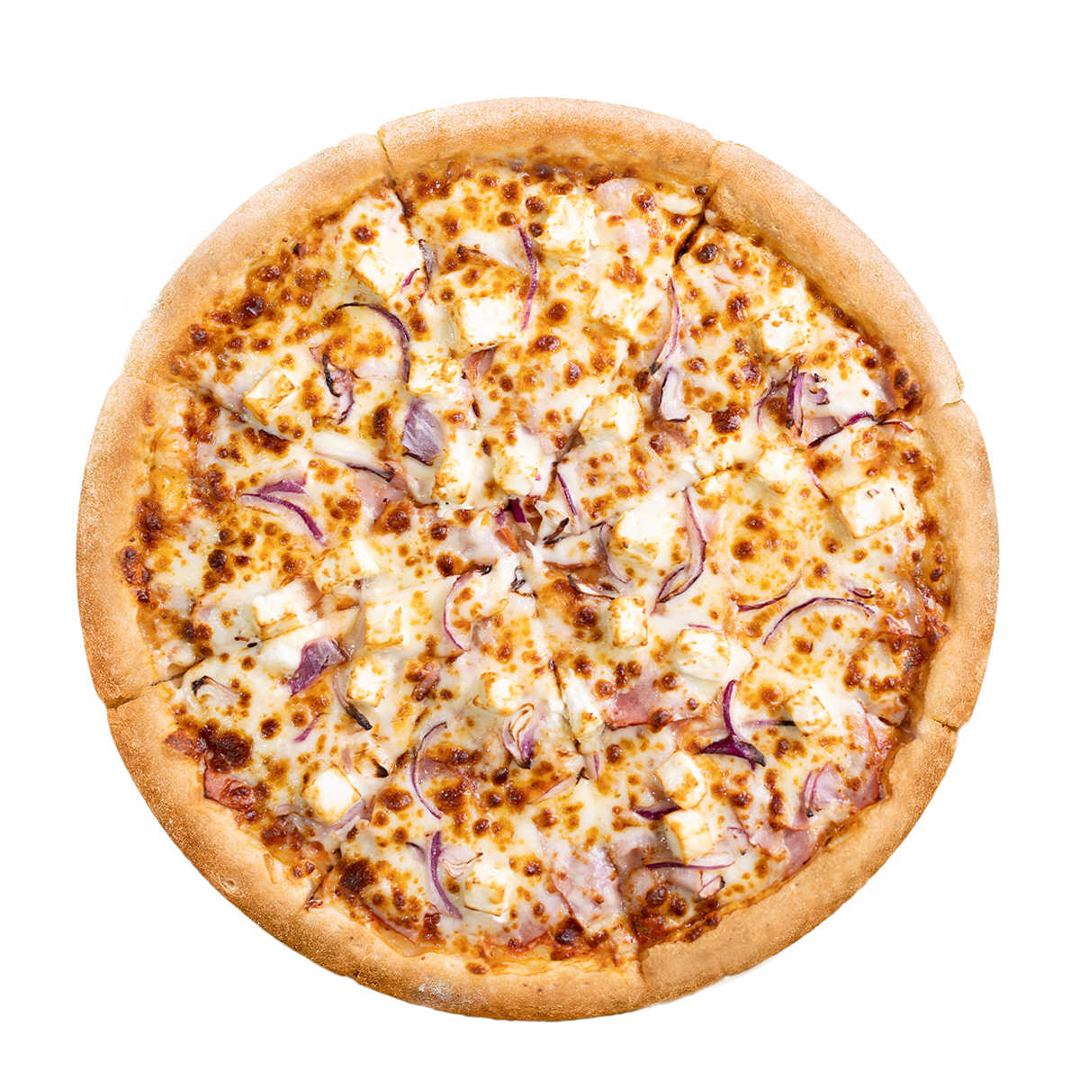 (aluat pizza, sos pizza, mozzarella + topping pizza, sunca, bacon, branza feta, ceapa)